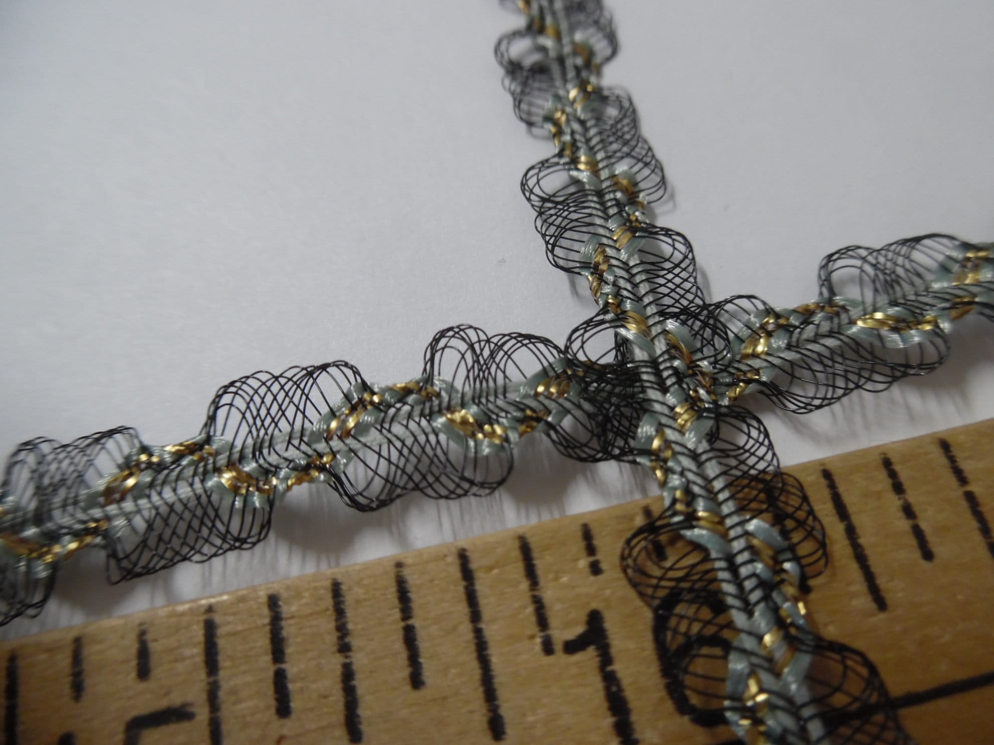 Welcome to French Fashions! Your one stop shop for doll fabrics and trims. French Passementerie trim. Loops of fine netting embellished with sage and gold threads. Very delicate. Rayon/Nylon blend. You are purchasing ******BY THE YARD***** Please ask any questions you have before purchasing as I like all sales to be final. NOTE: I HAVE THIS TRIM LISTED IN SEVERAL DIFFERENT COLOR COMBOS!